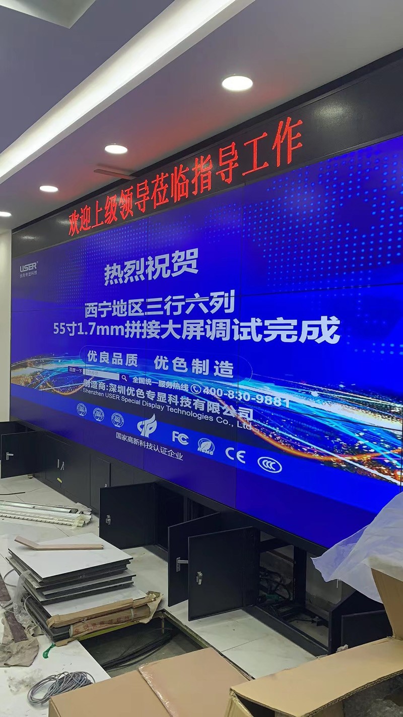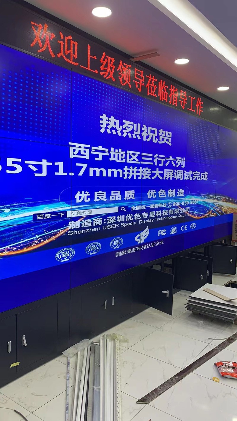 青海西寧黃河鑫業運維控制室液晶拼接屏,采用驗收專顯55寸1.8mm落地機柜頂部安裝LED條形屏方案,項目已安裝且驗收竣工。